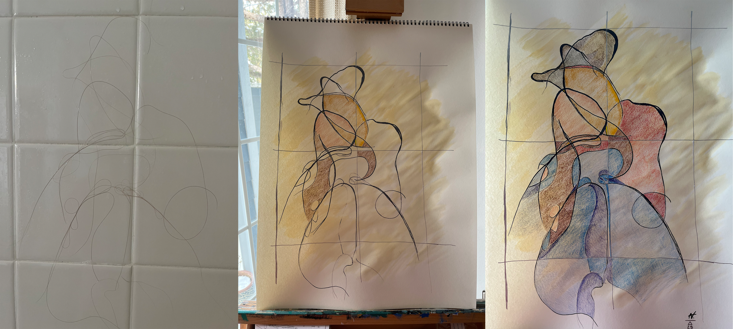 When I’m showering, I don’t ever want to clog the drain; so I put my hair on the shower wall and then wipe it off after every shower. One morning as I was staring at the shower wall, I realized that my hair had formed an image. So I took a picture of it, and decided to sketch it on my Strathmore Sketchpad. Since this first experience, during my showers I have been paying more attention to the hair on the shower wall and if there are any images that present themselves. This first image as seen here, I call, “The Embrace.” I see a man with a cowboy hat, holding a woman with long hair and a dress. I have not been able to see images in my hair after every shower, but I have used these shower perceptions as a sort of drawing exercise when they do show up.